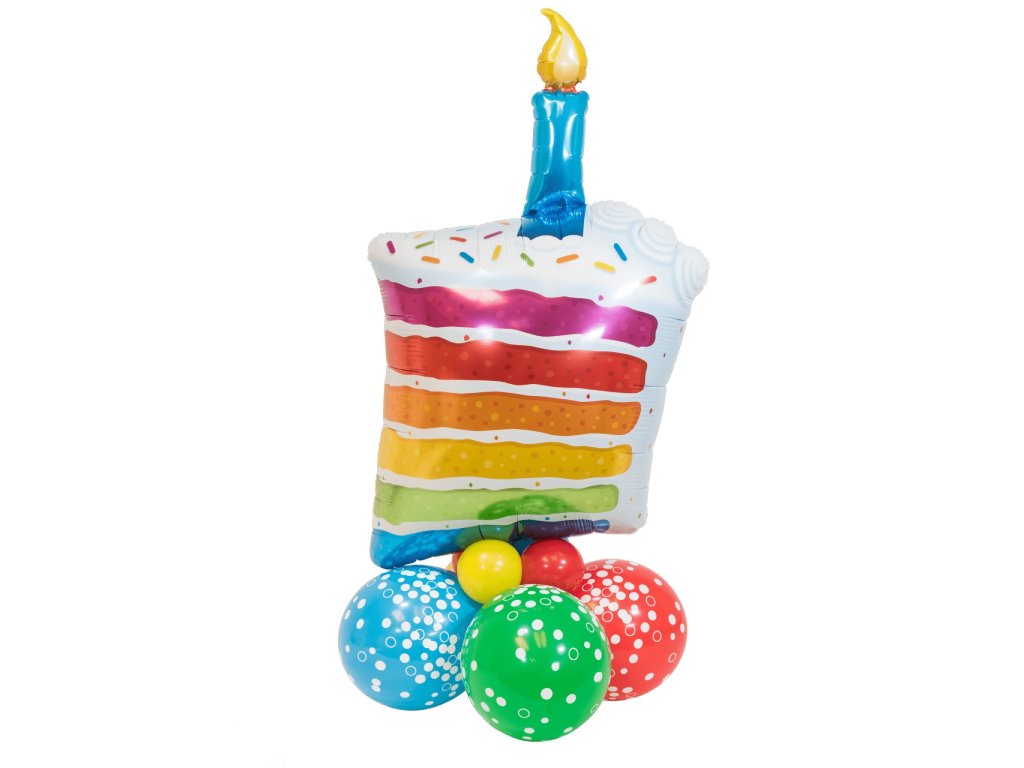 Fóliový balón ve tvaru duhového narozeninového dortu se svíčkou.