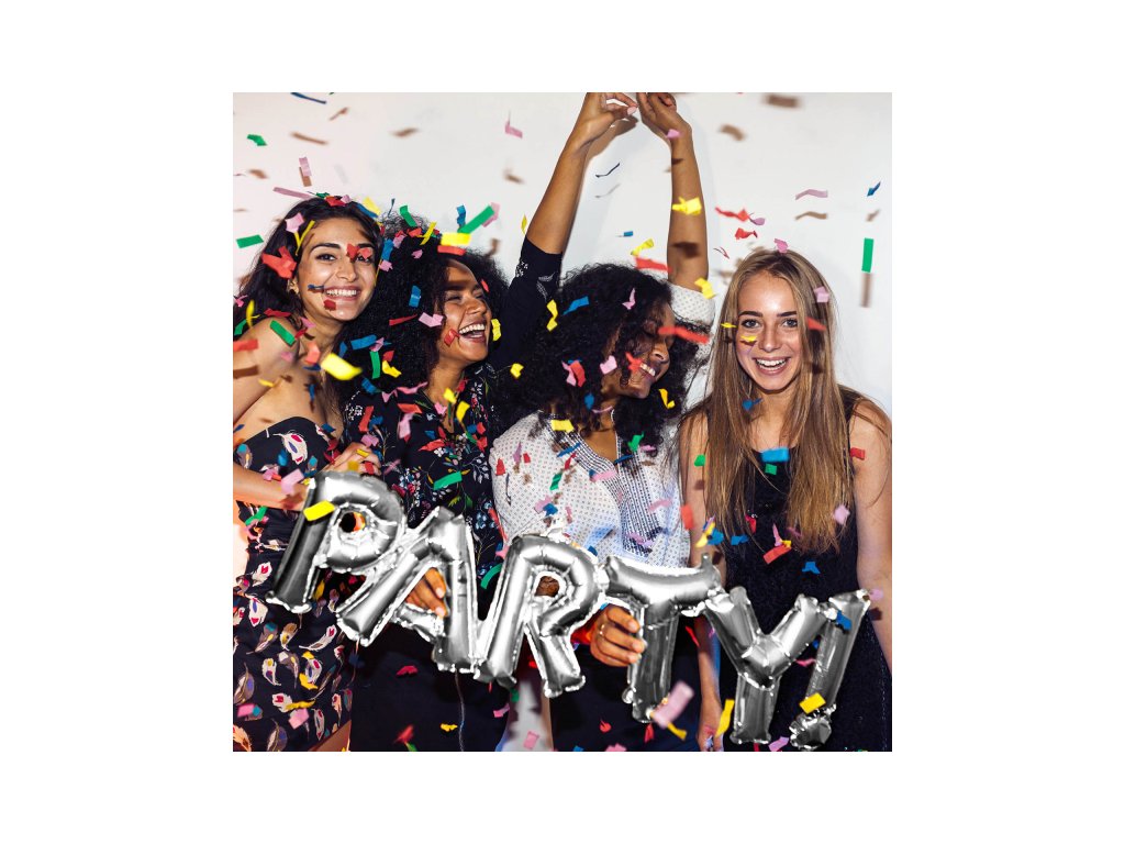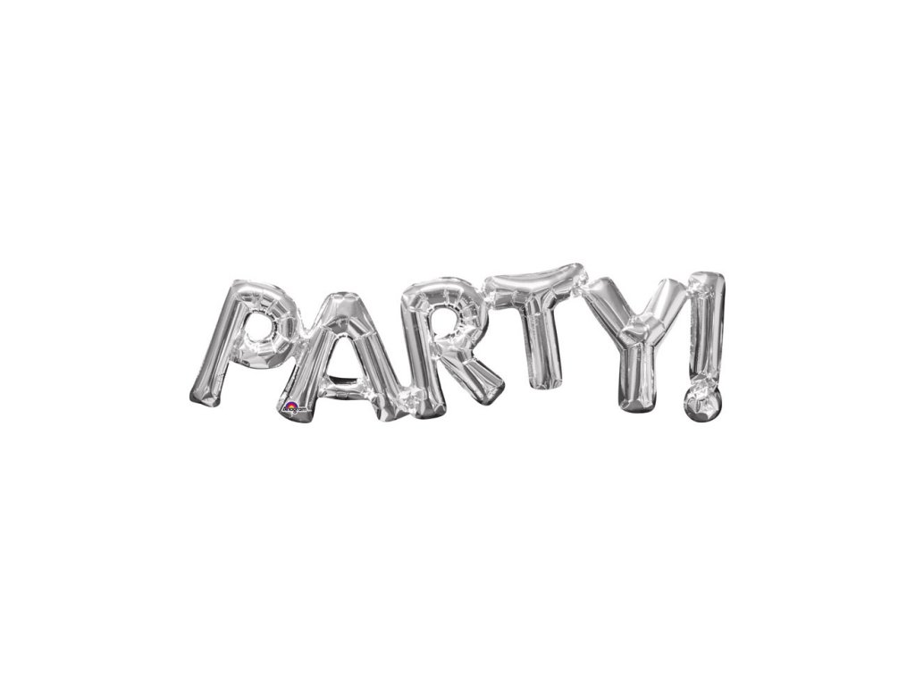 Fóliový balón - dekorace, jasná a zářivá písmena, nápis PARTY! ve stříbrném provedení.