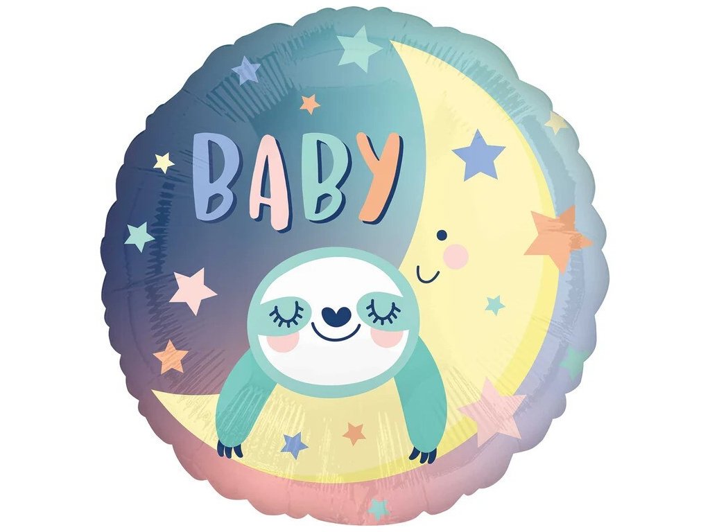 Fóliový balónek s motivem mláděte lenochoda spícího nad půlměsícem, v pastelových barvách a nápisem Baby, pro přivítání malého chlapečka nebo holčičky.