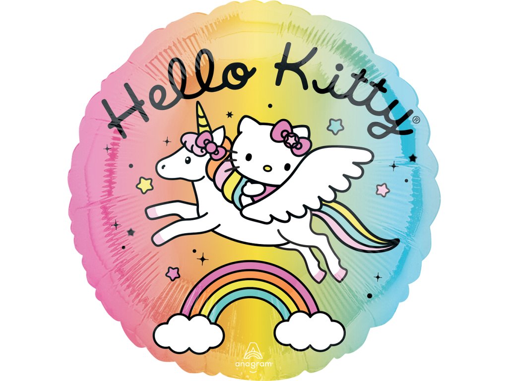 Klasický fóliový balónek v duhovém provedení s letícím jednorožcem a Hello Kitty.